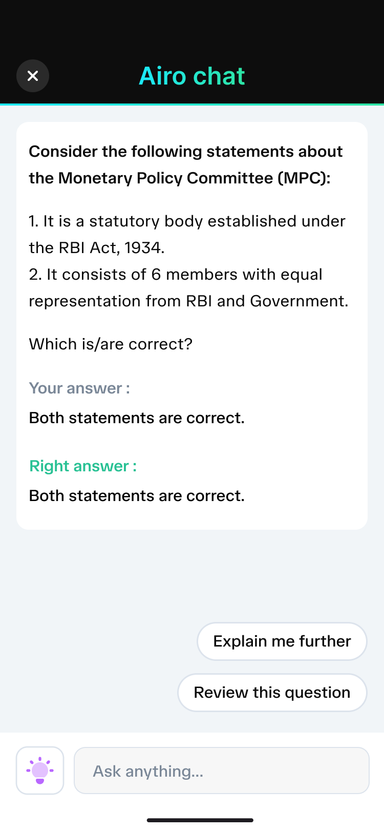 Just tap "Ask Airo" on any question and get instant explanations, follow ups, or similar practice questions. No waiting. No doubt backlog.